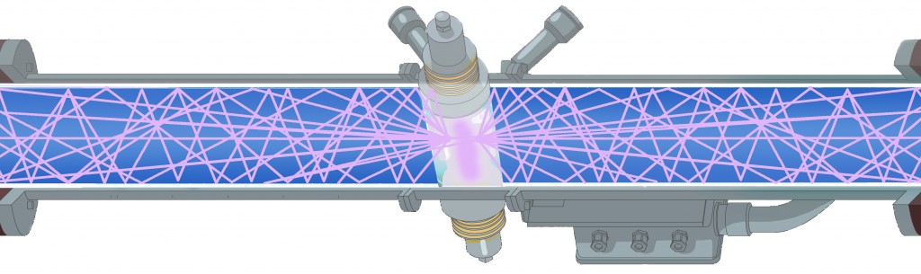 HOD消毒系统的核心是一个由石英制成的消毒室,周围有空气阻隔。这种结构有助于捕获紫外线的光线,并迫使它们在室内反复反弹,这种现象称为全内反射(TIR)。射线在腔室中的长路径与经过优化设计的水流以受控的、确定的模式结合在一起,形成了均匀的紫外线剂量分布,到达并使流经腔室的所有水中的微生物失活。这是一个关键因素,以达到高水平的微生物灭活效率在电力消耗。